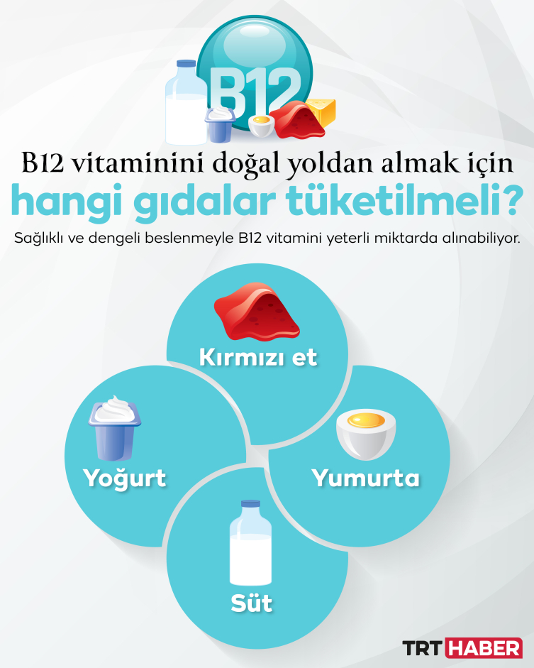 Belli hastalıkların sebep olması dışında normal sağlıklı bir insanda, B12 seviyesini normal düzeyde tutmak için sadece dışarıdan takviye almak gerekmiyor. B12 besin yoluyla da alınabiliyor. Bunun için özellikle hayvansal gıdalarla beslenilmesi gerektiğinin altını çizen Uzm. Dr. Boysan, “Haftada iki-üç porsiyon kırmızı et, haftada üç-beş adet yumurta, her gün bir kase yoğurt veya bir bardak süt tüketiliyorsa, yani normal ve dengeli bir şekilde besleniliyorsa ekstra bir takviyeye gerek yok” diyor.